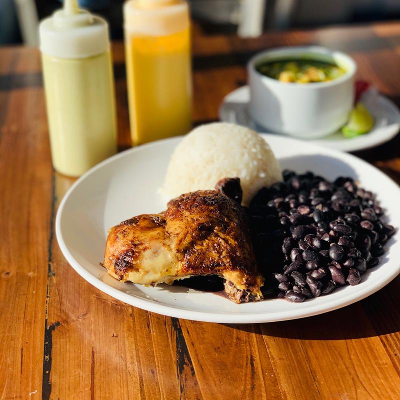 One-quarter Pollo a la Brasa served with black beans, white rice & sweet plantains | Con Arroz con Cilantro +$2.00